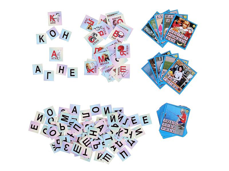 Играта съдържа: 30 букви с картинки, 3 препинателни знака, 30 карти, 105 букви и игрално поле с 3 упражнения.