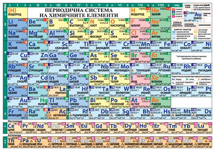 Съдържа атомен номер на всеки елемент, неговия химичен знак и агрегатно състояние при нормални условия, латинско и българско наименование, атомна маса, степени на окисление, електронна конфигурация; периоди и групи.