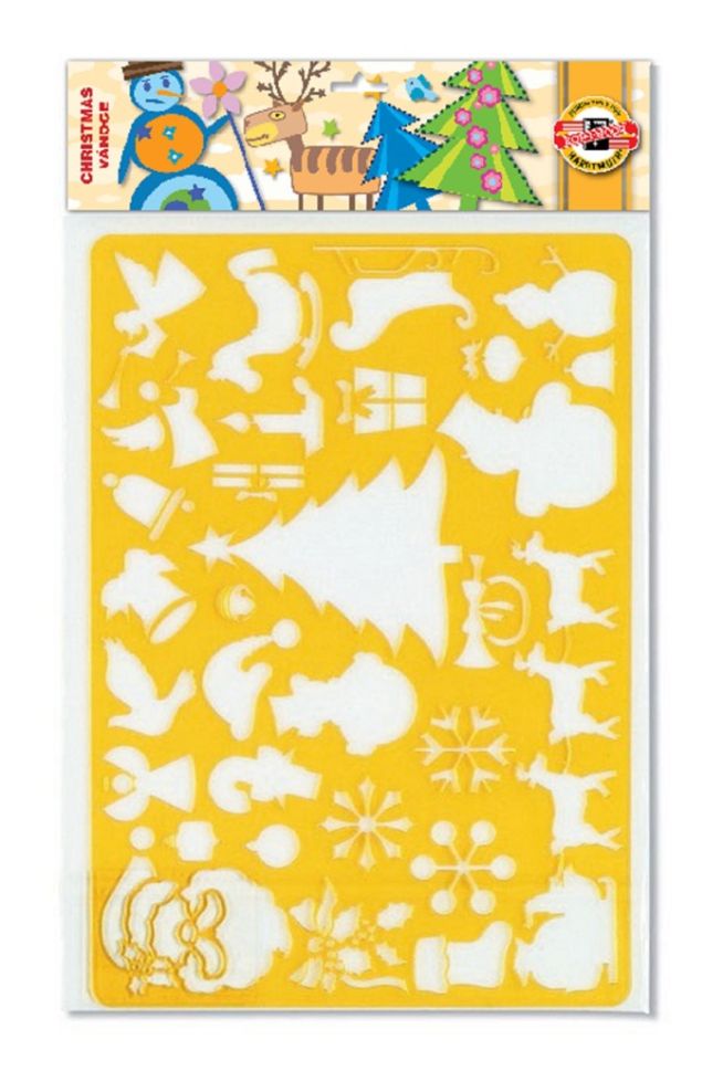 Удобен детски шаблон, изработен от устойчива прозрачна пластмаса в приятен жълт цвят. Тялото изобразява няколко основни коледни мотива, като предоставя на малчуганите много забавление по пътя към вълшебните светове на рисуването и първите им творчески изяви. Размер на шаблона 25.5 см. / 18.5 см.